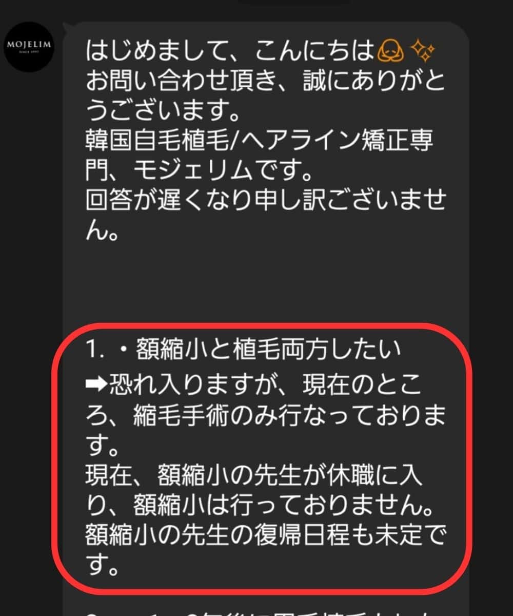 モジェリムさんでもカウンセリングを受けようと思って額縮小と植毛両方やりたいと伝えたら額縮小は現在行っていませんと回答が来ました。