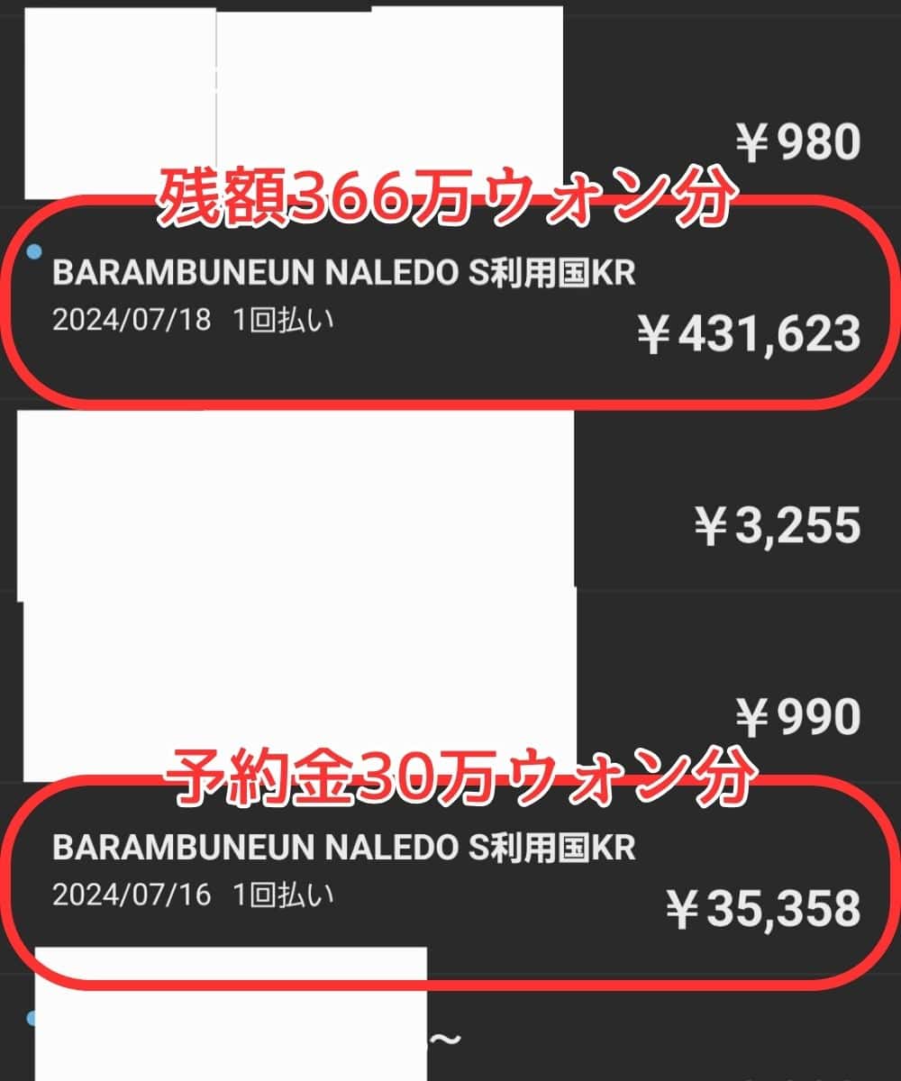 支払いは全額楽天ゴールドカード(VISA)でしてクリニックに支払った合計金額は30万ウォン(予約金)+366万ウォン(手術費用残り)=396万ウォン(466,981円)でした。